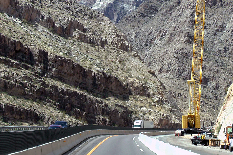 Durch die imposante Virgin River Schlucht führt mich der Interstate 15 hinunter in die große Wüste Nevada`s. Leider wird die normalerweise imposante Fahrt durch eine riesige Baustelle getrübt. Durch die flimmernde Hitze geht es immer geradeaus.