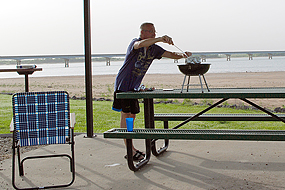 Um 6 Uhr wache ich auf. Das angekündigte schwere Gewitter zieht auf. Ich schalte den Fernseher ein, aber es gibt keine Tornadowarnung für Little Rock. Um 8 Uhr ist das Gewitter dann vorbei und ich fahre gleich los. Es ist bewölkt und die Gegend ist recht unspektakulär, deshalb entscheide ich mich für eine Gewalttour. Sie endet nach 314 Meilen am LakeTexoma. Wie man vom Namen ableiten kann bildet er die Grenze zwischen Texas und Oklahoma. Zuerst nehme ich eine ausgiebige Dusche, bei der Hitze natürlich draußen. Mein Womo steht direkt am See. Das Besondere hier ist, dass es kein Office gibt. Man nimmt einen Umschlag, schreibt Name und Platz darauf, packt die 15 $ Gebühr mit hinein und deponiert den Umschlag im Briefkasten. Es ist sehr ruhig hier. Relaxen ist angesagt, aber hungrig bin ich auch, also wird gegrillt und danach wieder relaxt.