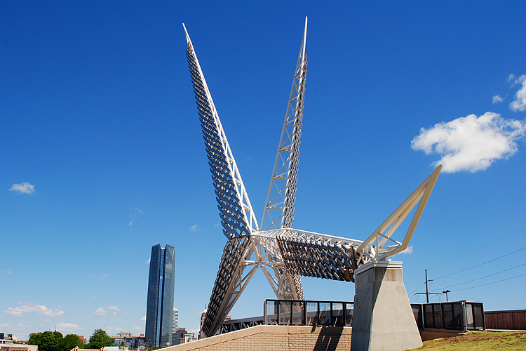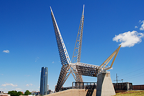Auf ein neues.... der kostenlose Bus bringt wieder in die Stadt. Ich laufe durch Bricktown, eine Weile am Fluß entlang und dann über eine Designerbrücke, vorbei an den beiden Arenen Redhawks Field (Baseball) und Chesapeak Energy Arena (Basketball) wieder in die Innenstadt.