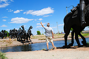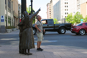 Benannt ist Wichita nach dem hier ursprünglich ansässigen Indianervolk, den Wichita. Die Stadt geht zurück auf eine indianische Siedlung, die sich 1863 an dieser Stelle befand. 1870 wurde Wichita zu einer Eisenbahnstation, zu der Viehtransporte aus Texas gelangten. Die Entdeckung von Erdöl 1914 leitete den Aufstieg Wichitas zu einer wohlhabenden Stadt ein. Als" Großstadt mit ländlichen (Wildwest)Charme" könnte man Wichita, das etwa auf halbem Weg zwischen den Metropolen Kansas City und Oklahoma City liegt, bezeichnen . Früher trieben die Cowboys ihre Rinder auf dem berühmten Chisholm Trail durch Wichita. Auch die Flugzeugindustrie verhalf Wichita zum Wohlstand und so stehen heute an der Douglas Avenue historische und moderne Skulpturen(gruppen). So erinnert eine bronzene Imbisstheke mit lebensgroßen Figuren an den Sommer 1958, als in Wichita mit den Lunch Counter Sit-Ins die Bürgerrechtsbewegung in Gang kam. ich geselle mich dazu und wir plaudern ein wenig.