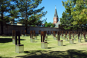 Natürlich kann man Oklahoma City nicht besuchen, ohne an den Terroranschlag am Morgen des 19.April 1995 erinnert zu werden. Der OKC National Memorial Park befindet sich an jener Stelle wo die Explosion mitten in der Stadt nicht nur ein Bürohochhaus zerstörte, sondern auch 168 Menschenleben forderte. Wo einst das Gebäude stand wurde ein Park als Ruheoase angelegt. 168 auf einer Grasfläche angeordnete gläserne Stühle symbolisieren die Opfer des Anschlags; in den gläsernen Sockel eines jeden Stuhls ist der Name eines der Opfer eingraviert.