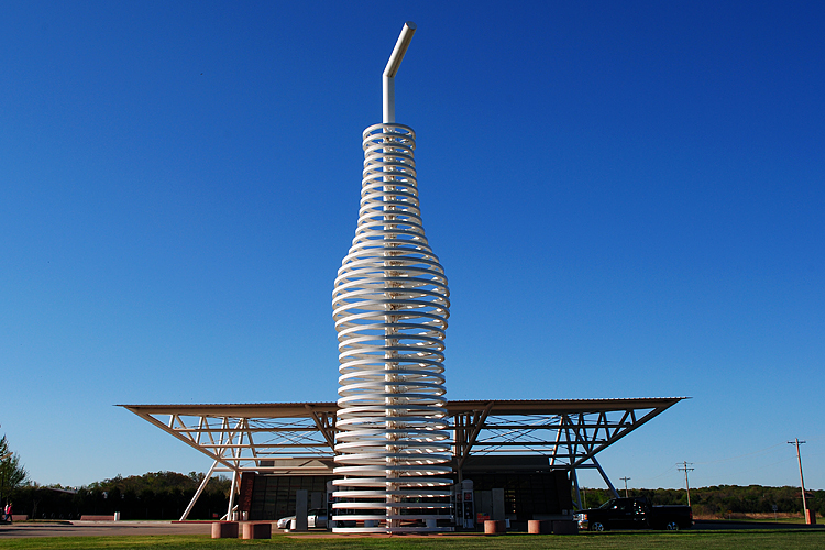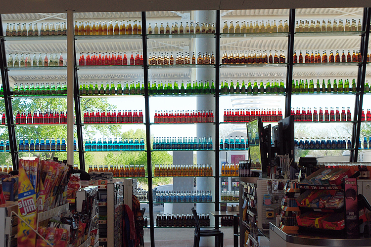 Es geht weiter, eine 1/2 Autostunde von OKC entfernt biege ich wieder auf die Route 66. Mein Ziel ist Arcadia. Nicht der Ort selbst ist interessant, sondern das Pops Store am Ortsrand. Sein Wahrzeichen ist eine riesige Colaflasche. Sie ist 66 Fuß hoch und wiegt 4 Tonnen. Die Höhe ist ein Hinweis auf die historische Straße. Der Store bietet 700 verschiedene Sorten von Soda an. Die ganze Glasfront ist zugestellt mit Sodaflasche.