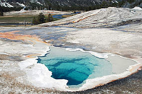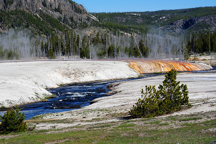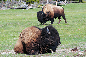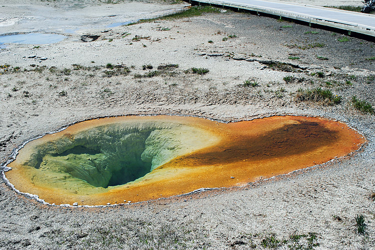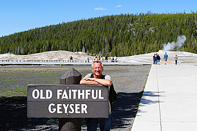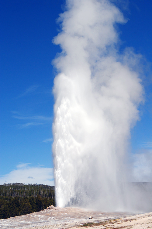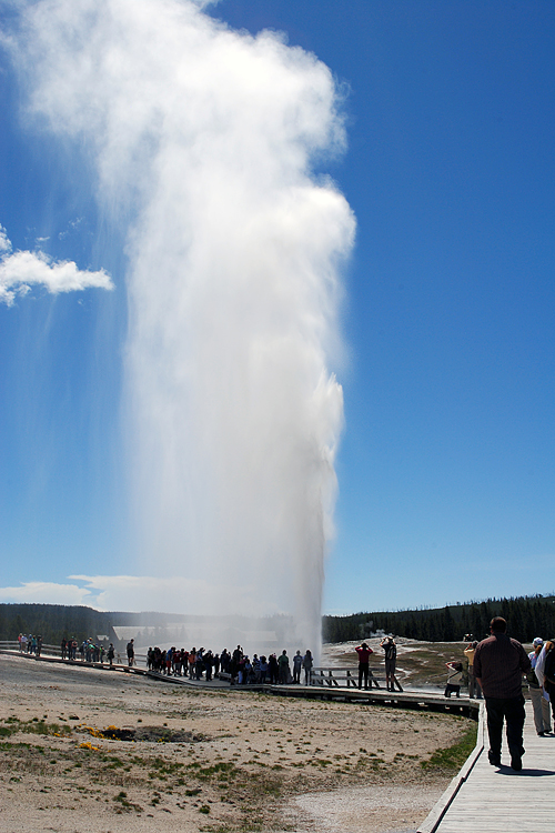 Es bleibt mir nichts anderes übrig als weiter zu fahren. Und das tue ich früh. Ich stehe um 6 Uhr auf, wieder fahre ich die Geysire ab und diesmal bin ich herrlich alleine. Nur die Geysire und ich, ohne Japaner. An einem Parkplatz grasen 3 riesige Bisons, die sich von mir nicht aus der Ruhe bringen lassen. Und so können wir uns in aller Ruhe gegenseitig beobachten. Als ich dann von einem der letzten Geysire auf meiner Tour zurückkomme sehe ich 2 Busse auf dem Parkplatz und schon kommt mir eine lärmende Horde Asiaten entgegen. Nichts wie weg hier, das denken sich wohl auch die Bisons. Aber einen Höhepunkt muß ich noch mitnehmen. Old Faithfull, der Geysir der zuverlässig fast jede Stunde eine 20 – 40 Meter hohe heisse Wasserfontaine zum Besten gibt.Aber auch sonst gibt es jede Menge anderer Geysire zu sehen, kleine, große, breite, unscheinbare und auch die Pools sind wunderschön anzusehen. Ich will gerade den Pfad zurück zum Parkplatz nehmen, da spricht mich ein junger Mann an. Er hat erfahren daß gleich ein Geysir ausbricht, der schon seit 4 Monaten nicht mehr ausgebrochen ist und der deutlich höhere Wassermassen ausspuckt als der Old Faithful. Und tatsächlich, 5 Minuten später schießt eine gewaltige heiße Wassermenge gen Himmel, und da der Geysir direkt am Pfad liegt, werden die Leute ziemlich nass.