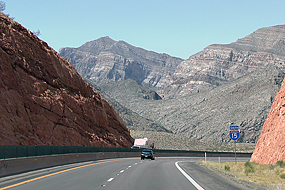 Durch die imposante Virgin River Schlucht führt mich der Interstate 15 hinunter in die große Wüste Nevada`s. Leider wird die normalerweise imposante Fahrt durch eine riesige Baustelle getrübt. Durch die flimmernde Hitze geht es immer geradeaus.